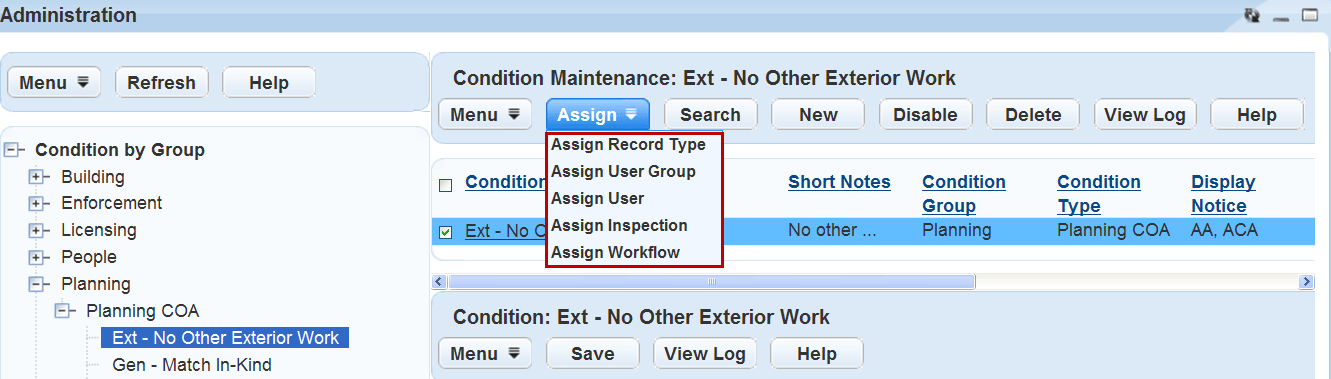 Use the main Administration navigation tree to locate the condition you need. You can locate a condition by Group, Condition Type, Name/Number, Application Type, Inspection, User Group, or User. If you cannot locate the condition name you want to apply, you can search for it. Refer to Assigning Conditions.
